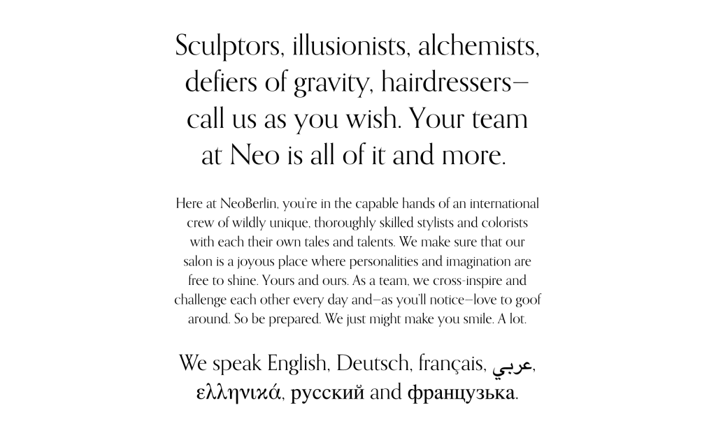 Here at NeoBerlin, you’re in the capable hands of an international crew of wildly unique, thoroughly skilled stylists and colorists with each their own tales and talents. We make sure that our salon is a joyous place where personalities and imagination are free to shine. Yours and ours. As a team, we cross-inspire and challenge each other every day and—as you’ll notice—love to goof around. So be prepared. We just might make you smile. A lot.