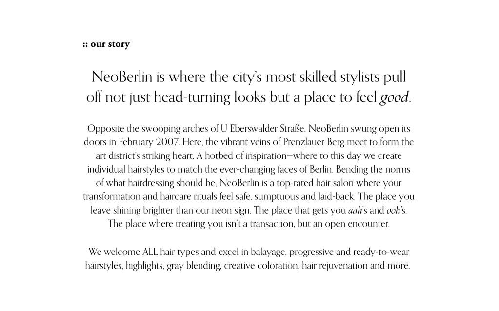 Opposite the swooping arches of U Eberswalder Straße, NeoBerlin swung open its doors in February 2007. Here, the vibrant veins of Prenzlauer Berg meet to form the art district’s striking heart. A hotbed of inspiration—where to this day we create individual hairstyles to match the ever-changing faces of Berlin. Bending the norms of what hairdressing should be, NeoBerlin is a top-rated hair salon where your transformation and haircare rituals feel safe, sumptuous and laid-back. The place you leave shining brighter than our neon sign. The place that gets you aah’s and ooh’s. The place where treating you isn’t a transaction, but an open encounter.
